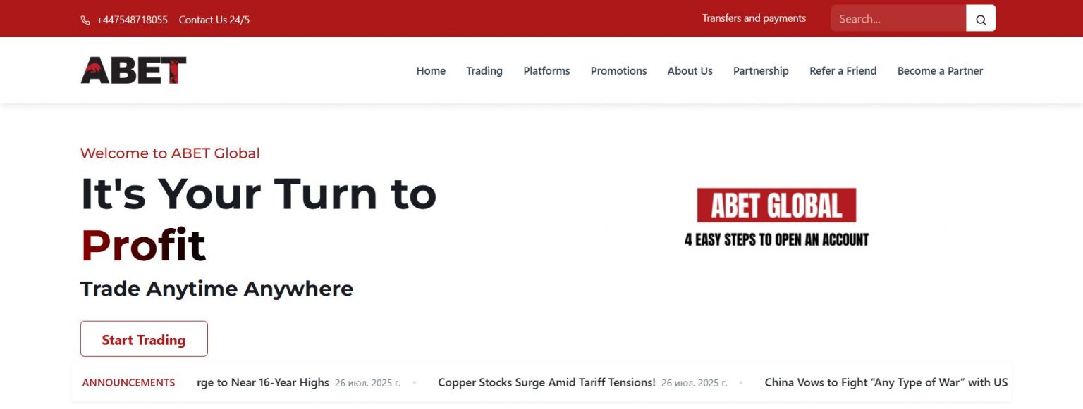 Abet Global (abetglobal.com) зарегистрирована в 2022 году. Компания позиционируется как болгарская, но юрисдикция не подтверждена. Домен молодой, с низкой посещаемостью и слабым web‑трафиком. Обещаются Forex, CFD, акции, металлы и криптовалюты. Максимальное кредитное плечо до 1:1000.