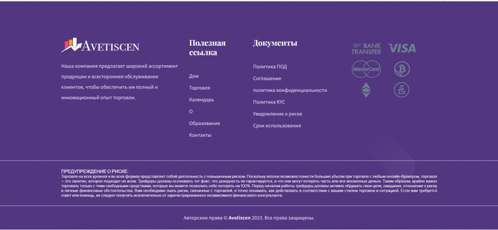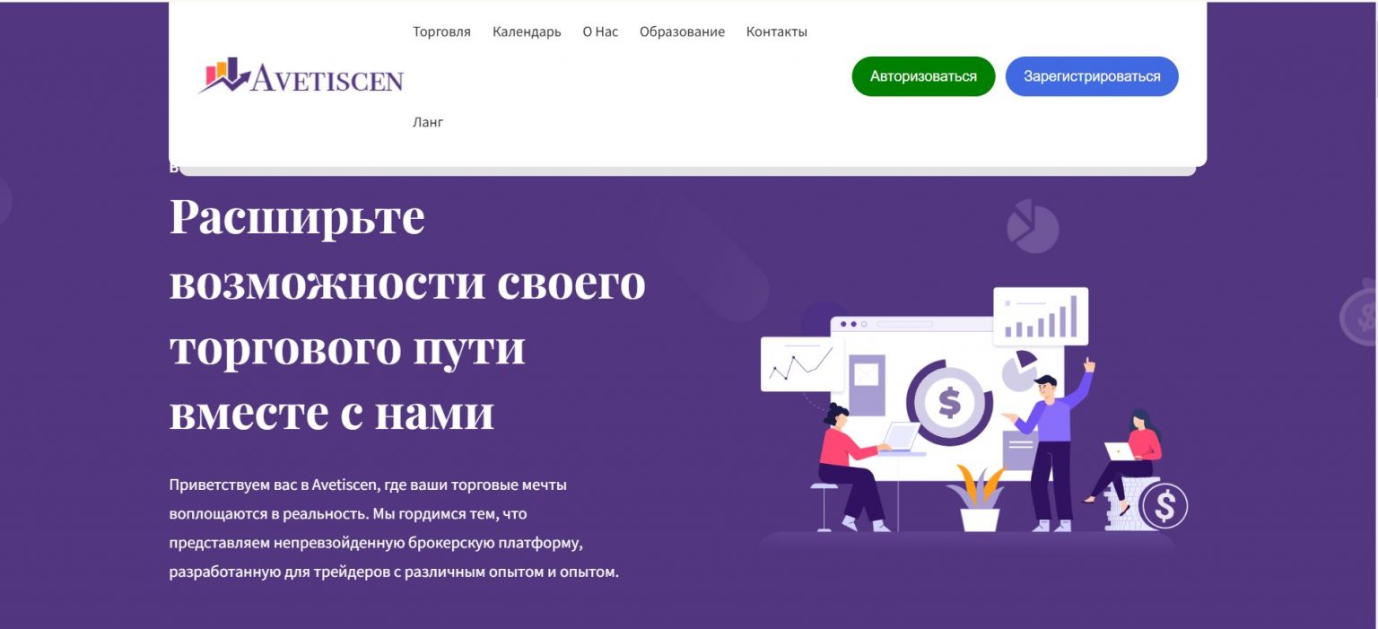 Avetiscen.com мошенники, которые маскируются под надежного брокера, обещая клиентам выгодные условия торговли. На своем сайте компания заявляет, что предоставляет доступ к торговле валютами, акциями, индексами и криптовалютами. Однако реальные факты доказывают, что это очередной обман.