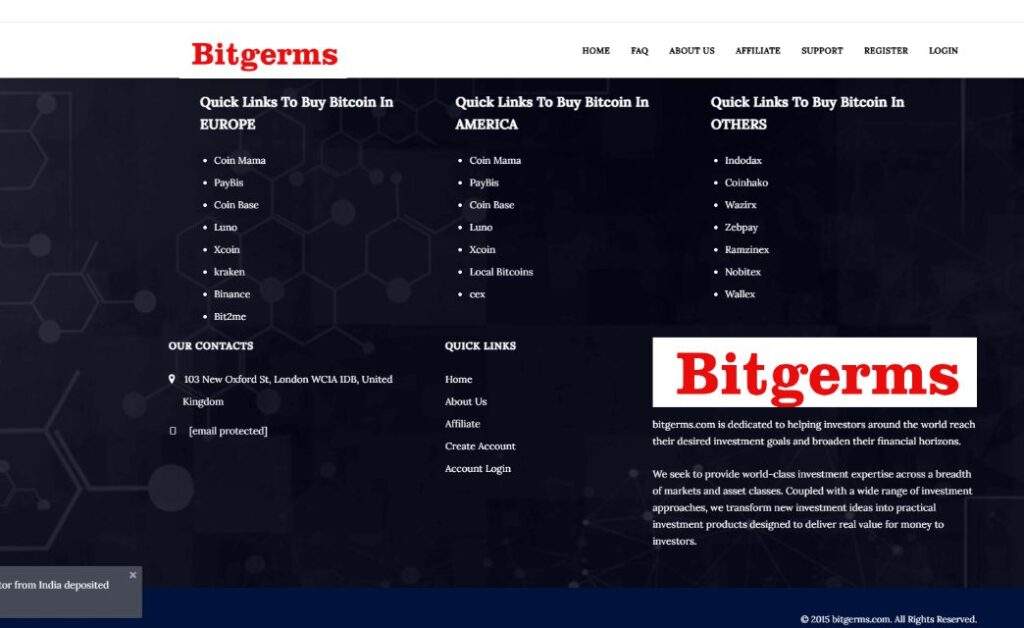 BitGerms (bitgerms.com) ненадежен из-за отсутствия лицензий и прозрачных условий.