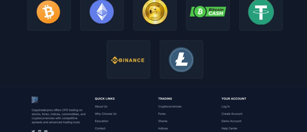 CopyTraderPros позиционируется как платформа для копитрейдинга без вложений в торговлю самому. На сайте утверждается, что пользователь просто выбирает трейдера и копирует его сделки. Тем не менее, юридическая информация и подтверждённая лицензия отсутствуют. Домен зарегистрирован недавно, а данные о компании не прозрачны. Всё это снижает доверие к брокеру.