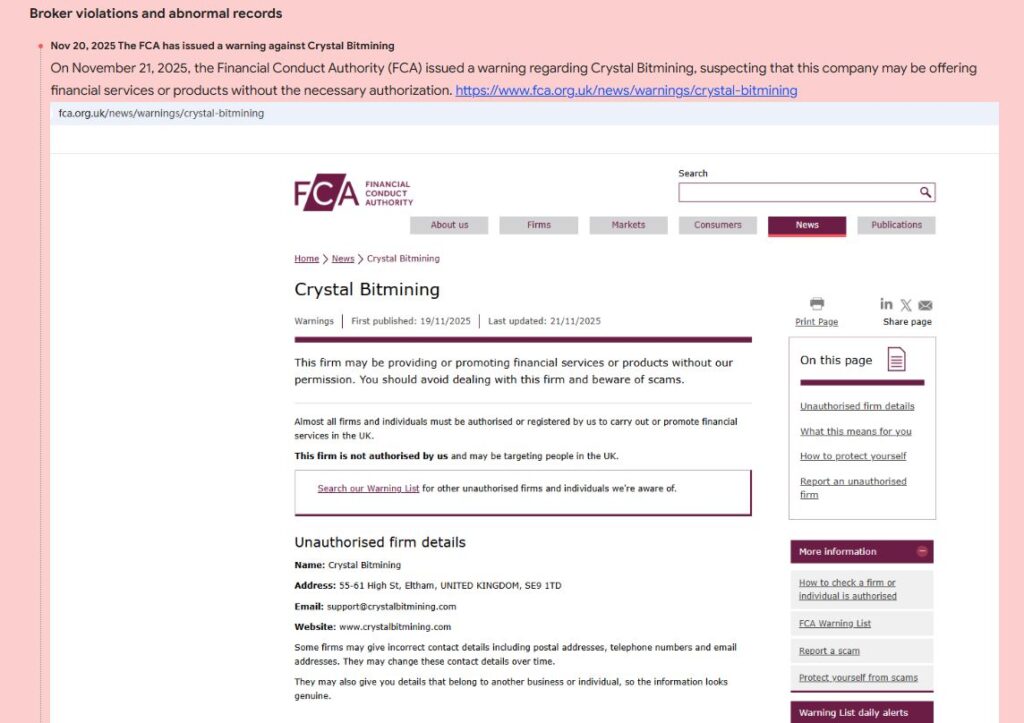 Crystal Bit Mining не публикует лицензии финансовых регуляторов.