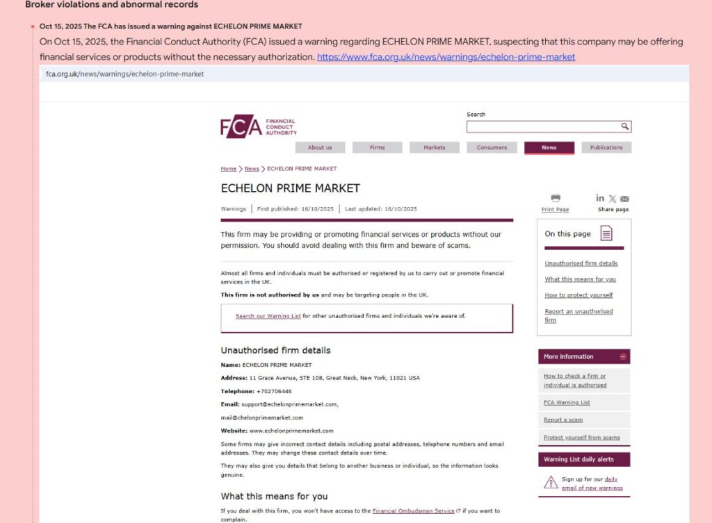 Брокер Echelon Prime Market (echelonprimemarket.com) обещает трейдинг с выгодой и комфортом. Он заявляет широкий выбор активов, поддержка клиентов и прозрачную торговую среду. Однако проверка выявила серьёзные несоответствия и тревожные сигналы. Ниже приводится подробный анализ.