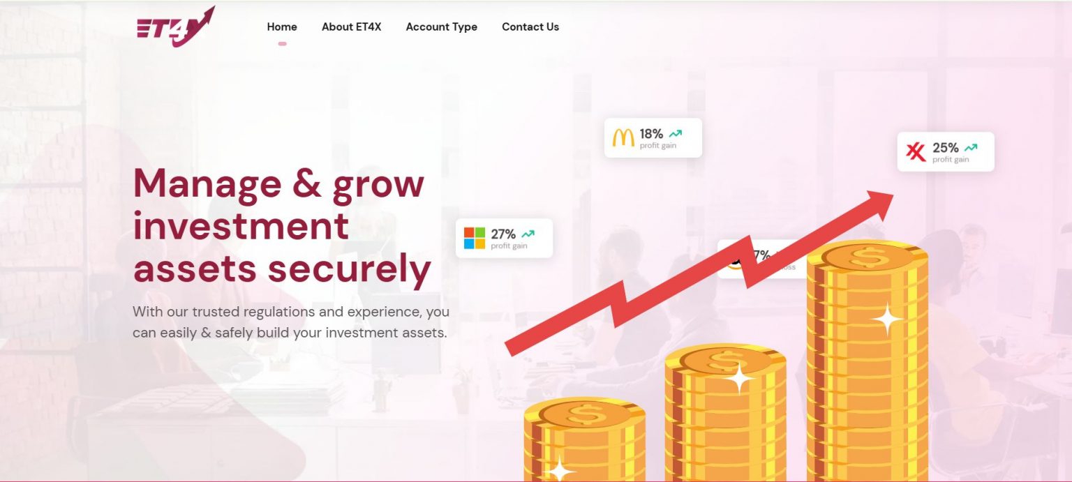 ET4X (et4x.com) позиционирует себя как платформа Forex и CFDs. Он обещает прибыль и надежную защиту инвесторов. Сайт указывает офис в Лондоне, UK. Однако этих адресов нет в официальных реестрах. Уже вызывает подозрение отсутствие реальных подтверждений.