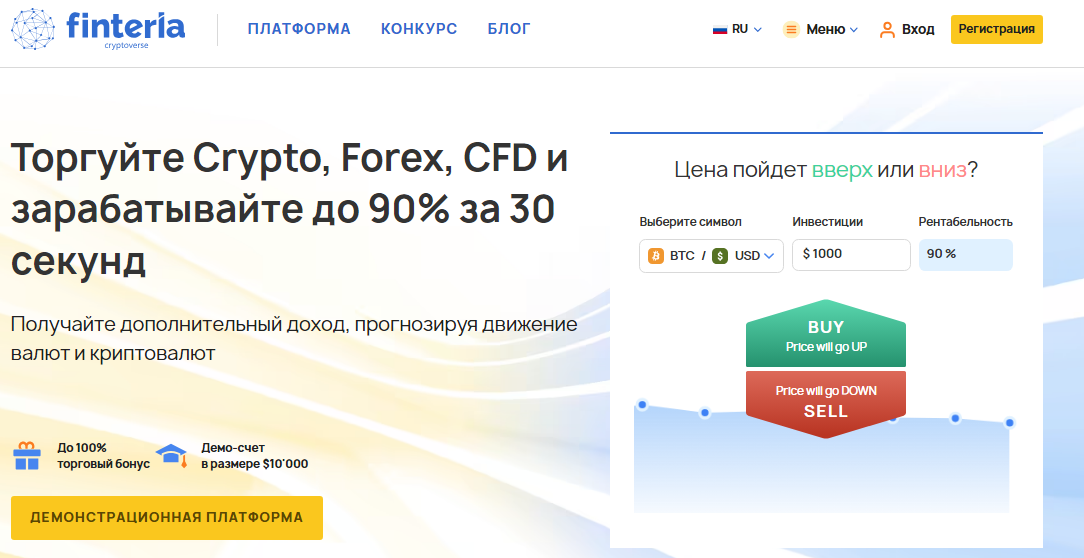 Finteria (finteria.pro) позиционирует себя как криптовалютный брокер, предлагающий торговлю различными активами, включая криптовалюты, Forex, CFD и сырьевые товары. Компания заявляет о нулевых торговых комиссиях, круглосуточной поддержке и быстром выводе средств в течение часа.