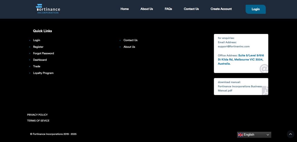 На сайте Fortinaninc есть информация, что компания действует в рамках международного права. Однако отсутствует любая информация о лицензии или регуляторе. Брокер не упоминается в реестрах известных финансовых органов. Нет юридического адреса, регистрационного номера и официальных документов. Все эти признаки указывают на отсутствие реального контроля и надзора.
