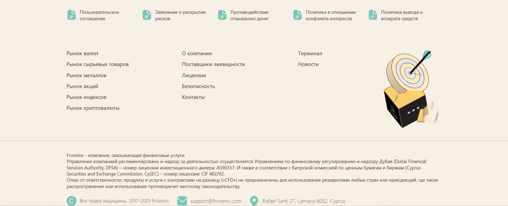 Наличие лицензии – главный показатель надежности брокера. Мошенники Froveinc.com не регулируются ни одной авторитетной организацией, такой как CySEC, FCA, ASIC или ЦБ РФ.