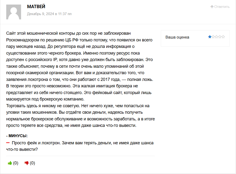 Кроме того, минимальный депозит превышает рыночные стандарты. После первого пополнения счета менеджеры убеждают клиентов внести еще больше денег. А при попытке вывода средств брокер либо накладывает необоснованные ограничения, либо вовсе блокирует аккаунт.