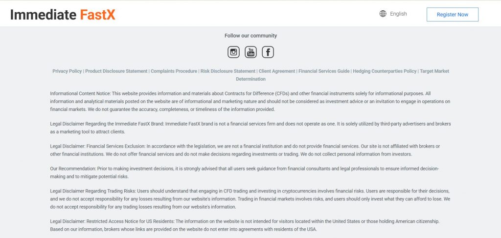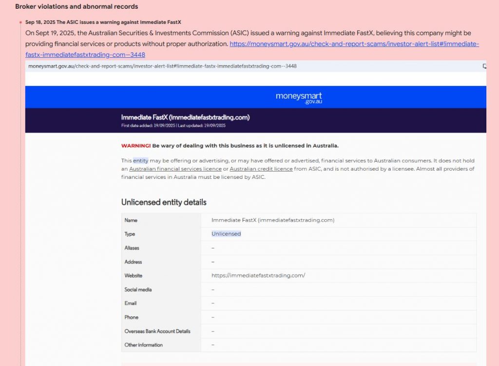 В открытых источниках ImmediateFastXTrading не подтверждён как регулируемый брокер. Наоборот — у ASIC имеется предупреждение о возможной незаконной деятельности. Это означает, что ImmediateFastX уже содержит важный тревожный сигнал. Работа без надёжного регулирования лишает клиентов юридической защиты.