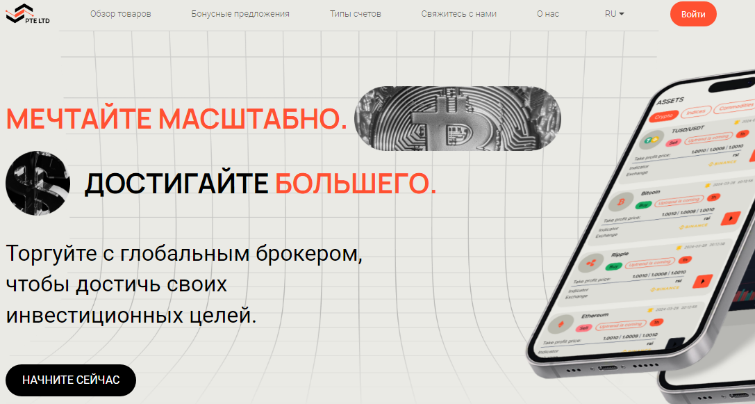 Investment PTE LTD (investment-pte.com) утверждает, что предоставляет доступ к инвестициям и торговле на финансовых рынках. На сайте заявлено, что компания имеет опыт работы на международном уровне. Брокер предлагает широкий спектр инструментов: Форекс, акции, криптовалюты и другие активы.