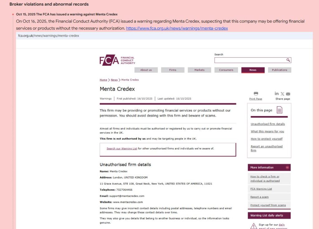 Menta Credex обзор показывает, что компания не имеет лицензии от официальных финансовых регуляторов. Брокер не зарегистрирован в системах FCA, ASIC, CySEC и других надзорных органов. Это означает, что его деятельность никак не контролируется. Клиенты остаются без правовой защиты и возможности вернуть свои средства. Работа без лицензии — главный признак ненадёжного и потенциально опасного брокера.