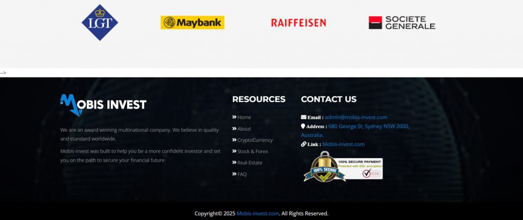 Mobis Invest позиционирует себя как международная инвестиционная платформа. На сайте заявляют, что брокер работает с Forex, криптовалютами и CFD. Утверждают, что созданы в 2018 году и имеют офис в Австралии. Но домен был зарегистрирован лишь в 2025 году. Данные о компании и регистрации не подтверждены независимо.