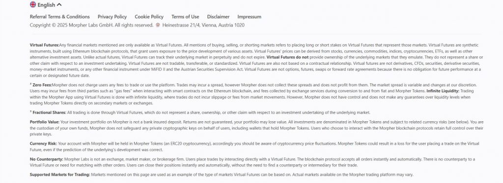 Платформа не предоставляет традиционных финансовых лицензий. Однако поддерживает прозрачность через блок-эксплорер Morpher Scan. Пользователи контролируют свои активы через некостодиальный кошелёк. Регулируется законом ЕС (GDPR и MiFID II). Тем не менее, отсутствие лицензий — потенциальный риск.