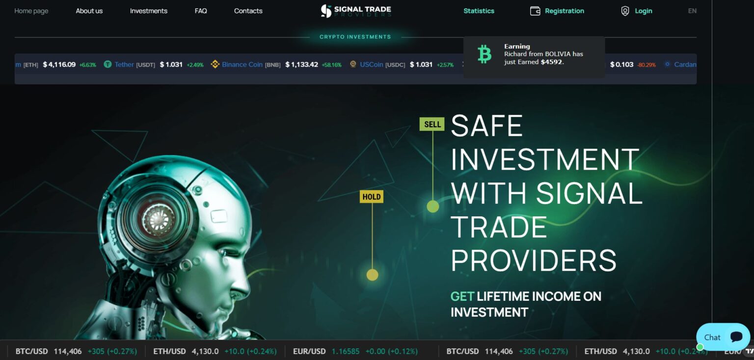 SignalTradeProviders (signaltradeproviders.com) объявляет себя поставщиком торговых сигналов и брокерским сервисом. На сайте рекламируются обещания высокой доходности и быстрый старт. Однако информация о компании, лицензиях и владельцах практически отсутствует. Доменные данные не подтверждают долгую историю работы. Эти факты ставят под сомнение прозрачность и честность платформы.