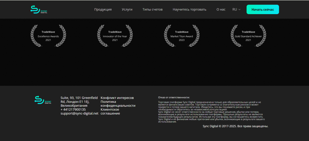 Проверка домена sync-digital.net через WHOIS показала, что сайт был зарегистрирован совсем недавно – в 2023 году. Тем не менее, брокер заявляет о «многолетнем опыте» работы на финансовых рынках, что сразу указывает на ложную информацию и попытку обмана.