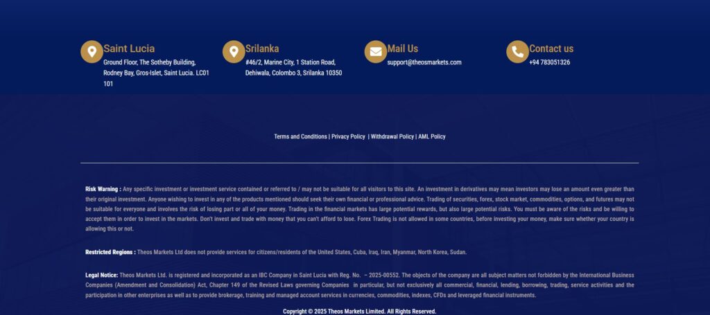Theos Markets (theosmarkets.com) не указывает наличие лицензий от FCA, CySEC или ЦБ РФ.