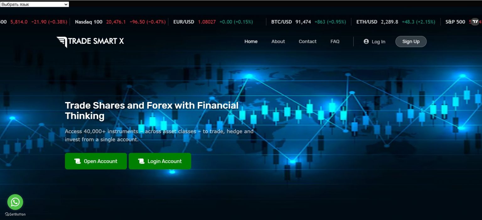 TradeSmartx позиционирует себя как ведущий поставщик финансовых услуг. Компания предлагает доступ к более чем 40 000 инструментов для торговли и инвестирования. Однако, возраст домена и история компании не указаны, что вызывает сомнения в их опыте.