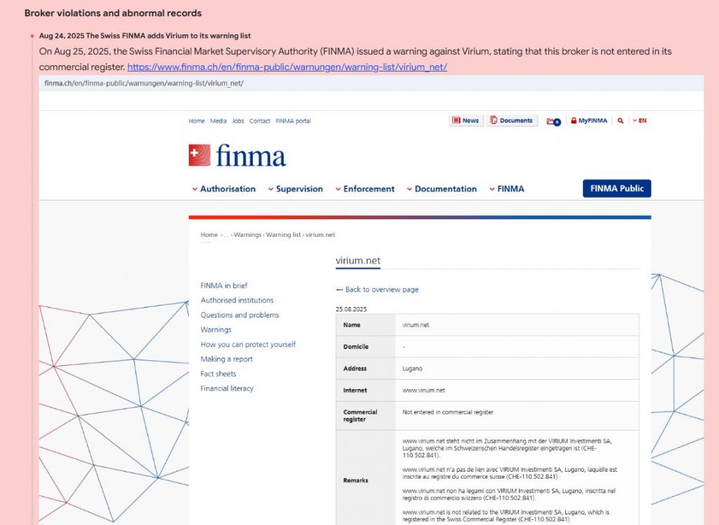 Virium утверждает, что имеет швейцарскую лицензию. Однако ни в одном официальном регистре FINMA брокер не числится. Кроме того, на сайте отсутствует номер лицензии или ссылка на регулятора. Это говорит о том, что деятельность компании фактически не контролируется и не защищает клиентов.
