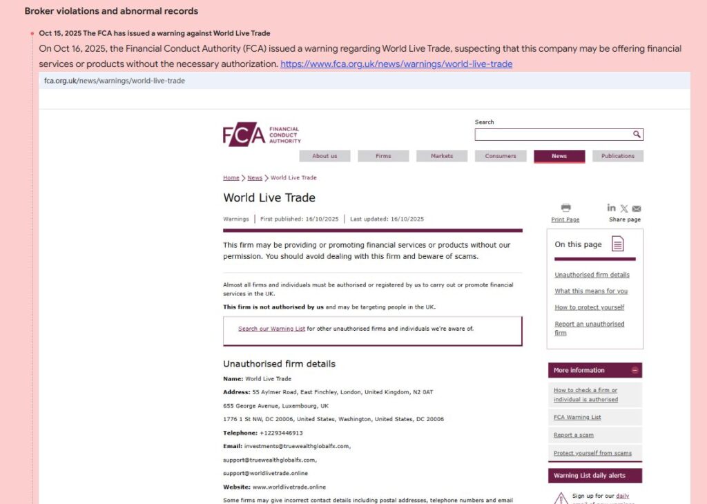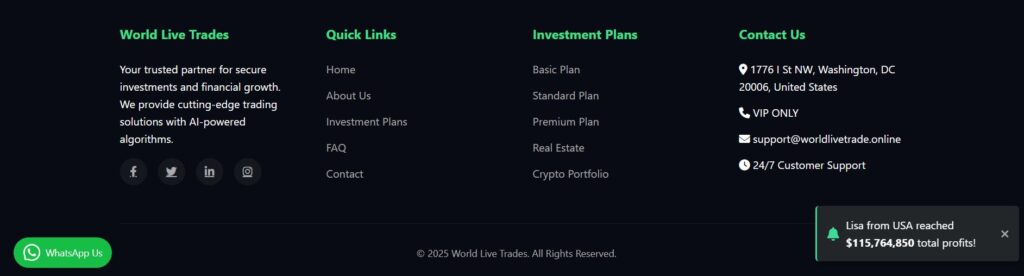 WorldLiveTrade (worldlivetrade.online) утверждает, что предоставляет автоматическую торговлю и инвестиции. На сайте обещают ежедневную прибыль и высокий доход. Например, обещается 2 % ежедневного дохода при минимальном вложении. Однако регистрирующие данные вызывают серьёзные сомнения. Компания заявляет, что имеет лицензию, но проверка показывает отсутствие надёжных подтверждений. Уже на этом этапе WorldLiveTrade обзор фиксирует множество тревожных сигналов.